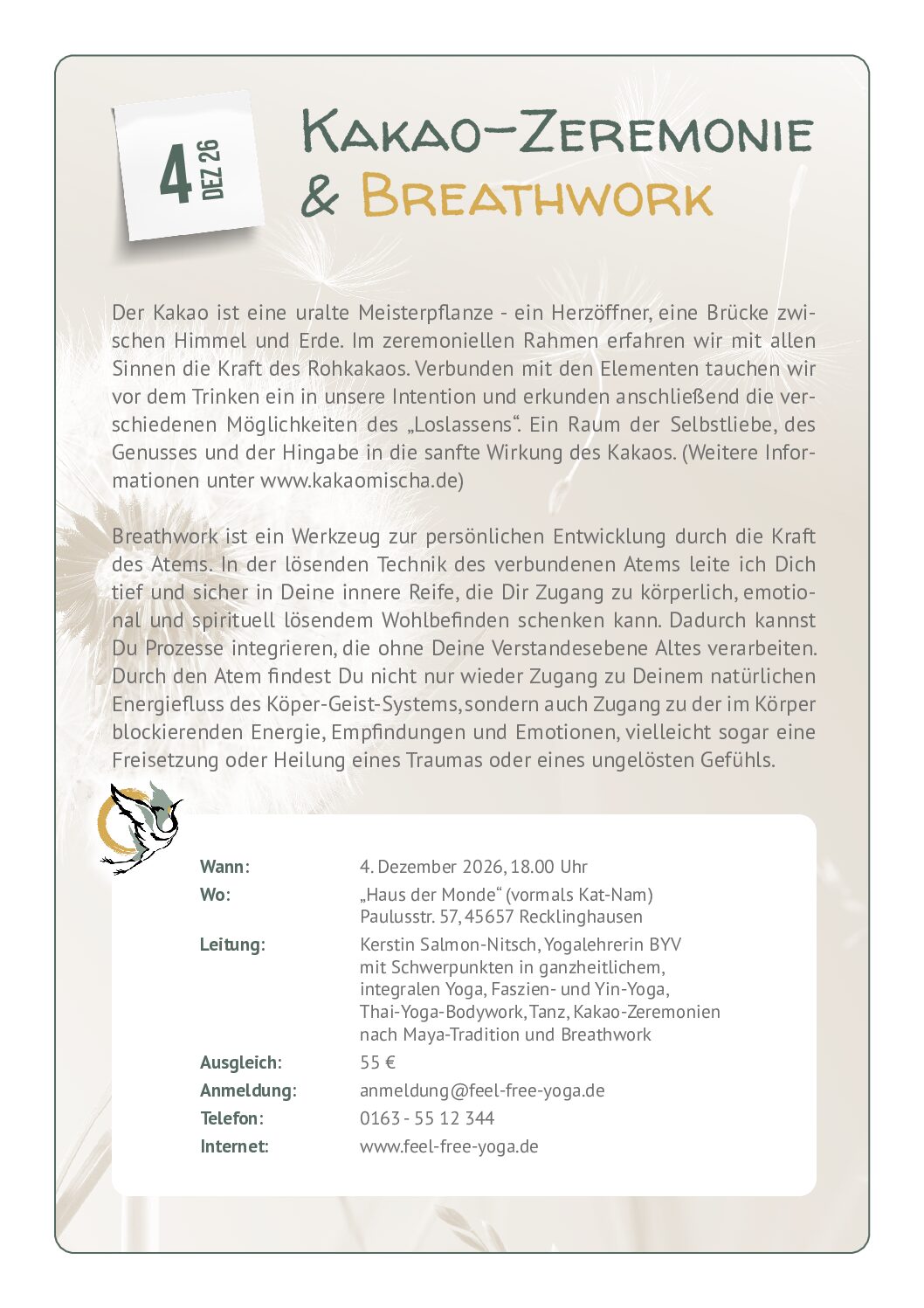 Der Kakao ist eine uralte Meisterpflanze – ein Herzöffner, eine Brücke zwischen Himmel und Erde. Im zeremoniellen Rahmen erfahren wir mit allen Sinnen die Kraft des Rohkakaos. Verbunden mit den Elementen tauchen wir vor dem Trinken ein in unsere Intention und erkunden anschließend die verschiedenen Möglichkeiten des „Loslassens“. Ein Raum der Selbstliebe, des Genusses und der Hingabe in die sanfte Wirkung des Kakaos. (Weitere Informationen unter www.kakaomischa.de)
