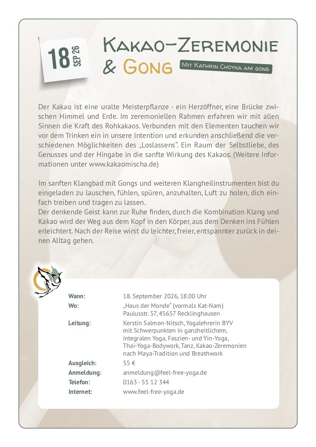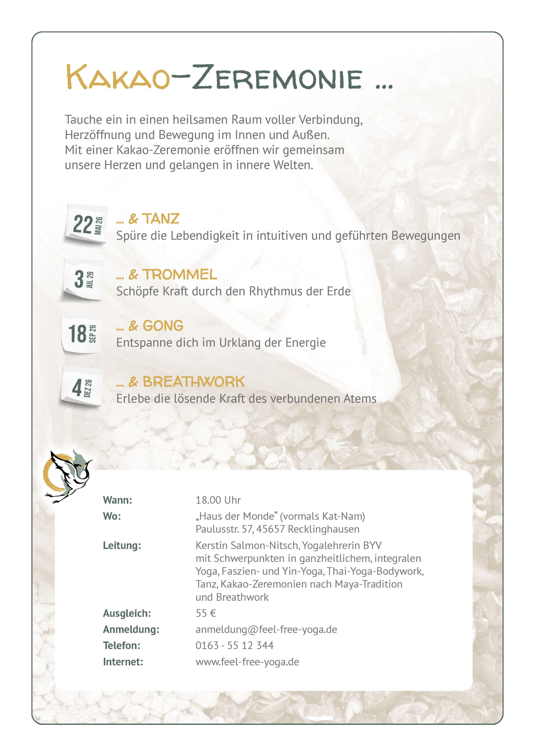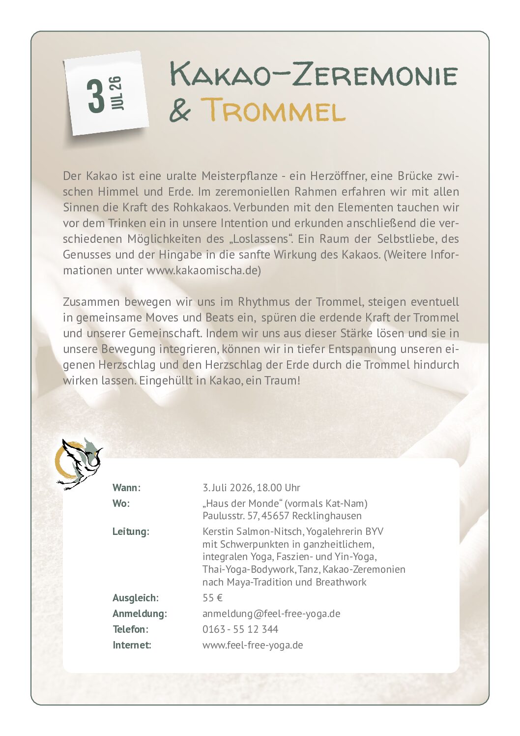 Zusammen bewegen wir uns im Rhythmus der Trommel, steigen eventuell in gemeinsame Moves und Beats ein, spüren die erdende Kraft der Trommel und unserer Gemeinschaft. Indem wir uns aus dieser Stärke lösen und sie in unsere Bewegung integrieren, können wir in tiefer Entspannung unseren eigenen Herzschlag und den Herzschlag der Erde durch die Trommel hindurch wirken lassen. Eingehüllt in Kakao, ein Traum!