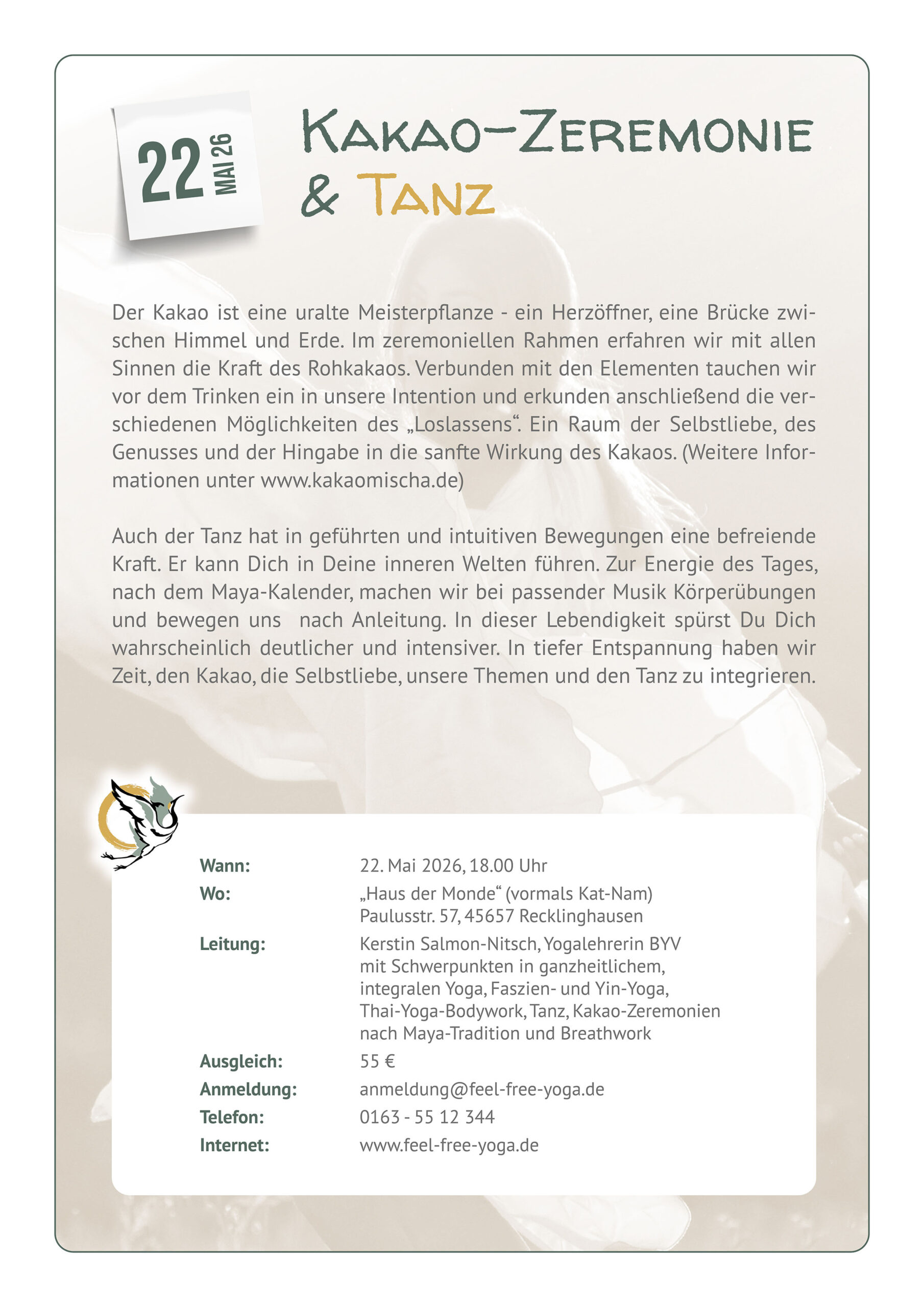 Auch der Tanz hat in geführten und intuitiven Bewegungen eine befreiende Kraft. Er kann Dich in Deine inneren Welten führen. Zur Energie des Tages, nach dem Maya-Kalender, machen wir bei passender Musik Körperübungen und bewegen uns nach Anleitung. In dieser Lebendigkeit spürst Du Dich wahrscheinlich deutlicher und intensiver. In tiefer Entspannung haben wir Zeit, den Kakao, die Selbstliebe, unsere Themen und den Tanz zu integrieren.